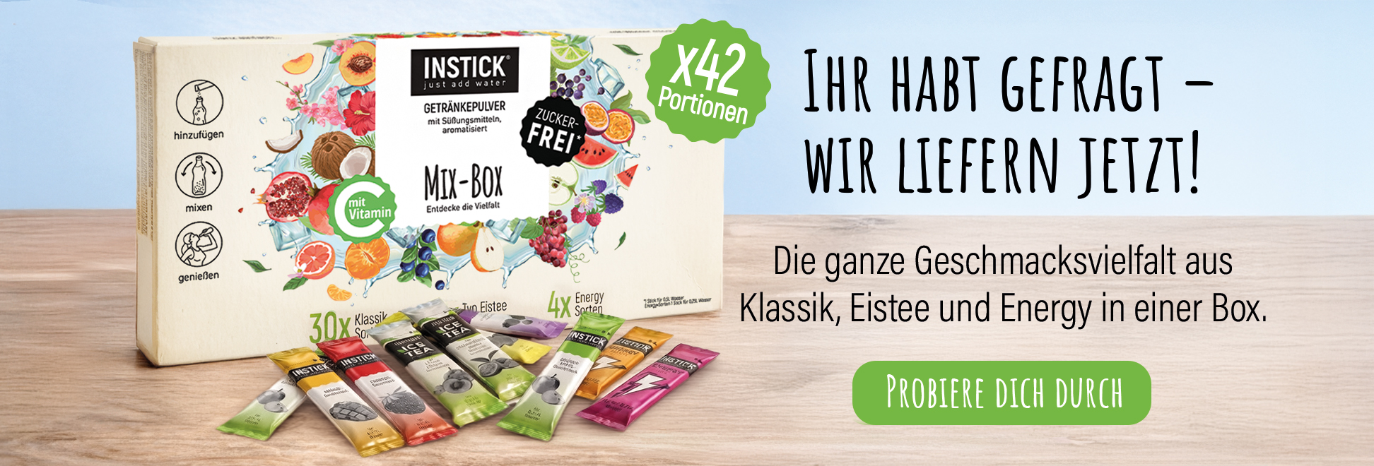 Aus unseren Instant-Pulvern kannst Du Dir ganz einfach ein zuckerfreies Erfrischungsgetränk in den Sorten wie zum Beispiel Energy, Eistee, Cola, Orange, Kirsche, Vanille, Eiskaffee oder mit unseren Extracts Sorten anmischen. Du kannst unsere Sticks selbst dosieren und sowohl in kaltem und heißem Wasser, als auch in Milch oder Milchalternativen auflösen und somit auch zum Süßen von Desserts verwenden. Wenn Du noch mehr über INSTICK erfahren möchtest, dann schau doch auf unserer FAQ Seite vorbei.